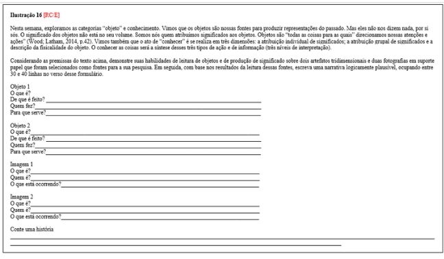 Na ilustração 4.14 temos um exemplo, focado na análise de utensílios e imagens fotográficas. A prova é acompanhada de uma orientação teórica e um formulário com dois tipos combinados de comando: a resposta curta e o breve ensaio em forma de narrativa.